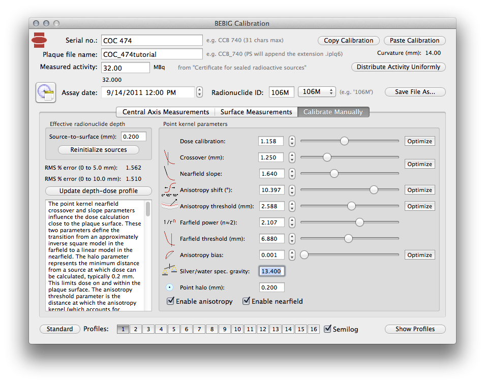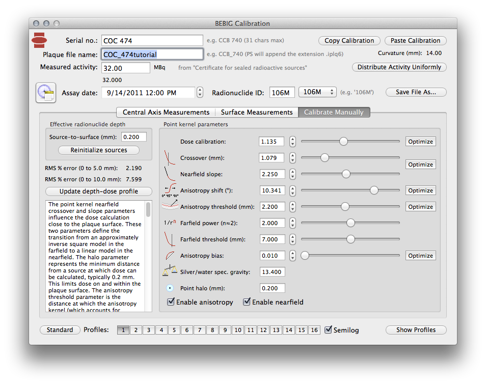 These are the starting conditions of the Calibrate Manually tab following simulated annealing of the radionuclide source strength distribution in the Surface Measurements tab.