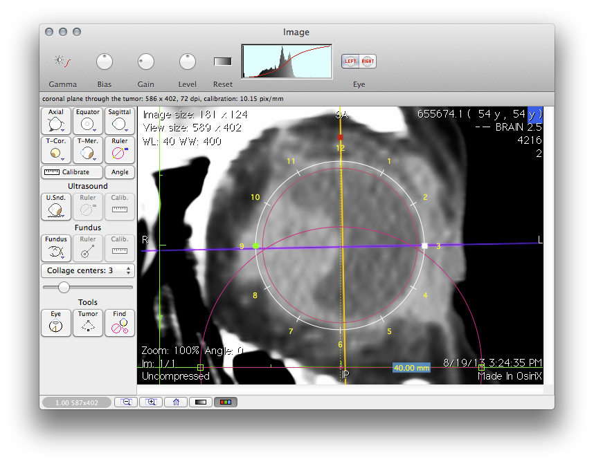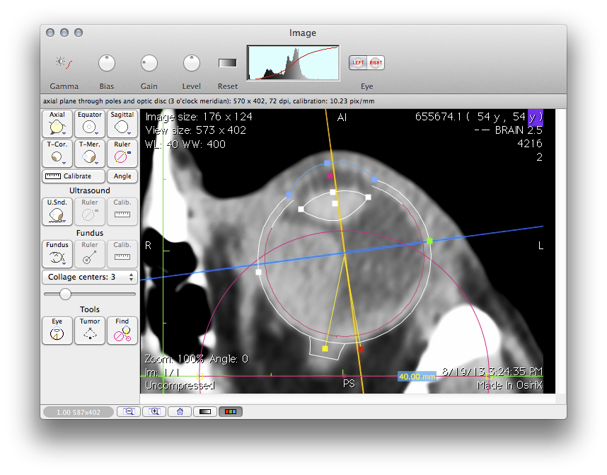 After the images have been prepared, they will be imported into Plaque Simulator, typically as .jpg files, and calibrated. A 3D model of the eye will be created and the tumor location and altitude entered. Please review these links before proceeding with this tutorial.