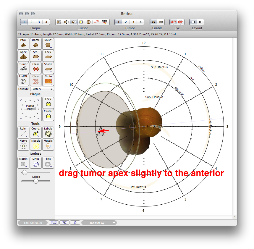 The Standard Tumor sheet always returns the tumor apex to a point directly above the geometric center of the elliptical tumor base. Observe that the apex of this tumor needs to be shifted anteriorly to better model the tumor and the measurements. Set the Retinal Diagram window cursor mode to drag apex in the toolbar and then nudge the tumor a bit anteriorly along the meridian plane projection until the tumor matches in the Planar Dosimetry window.