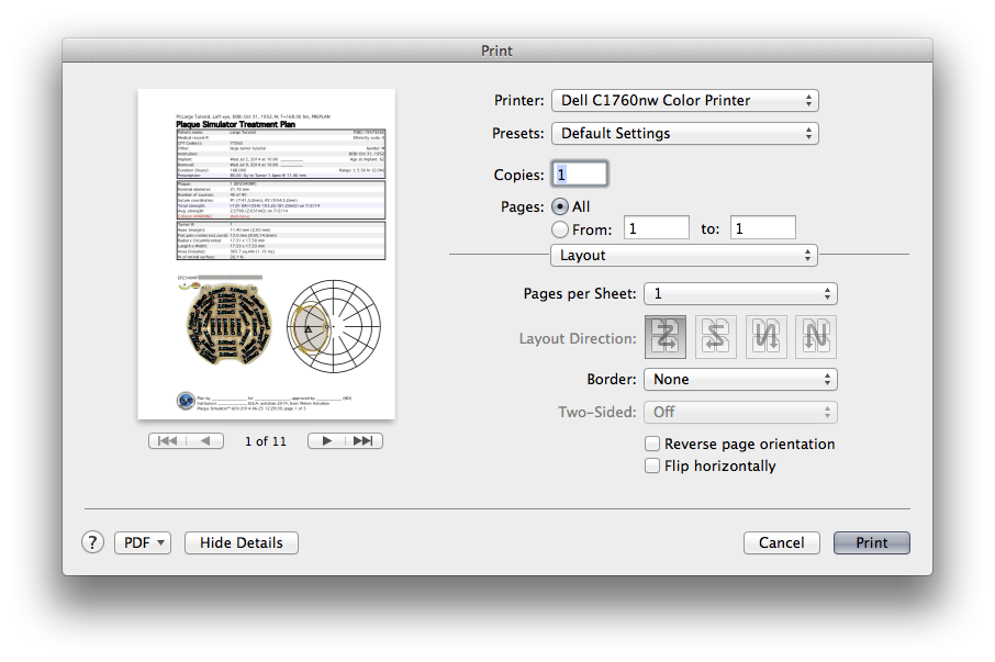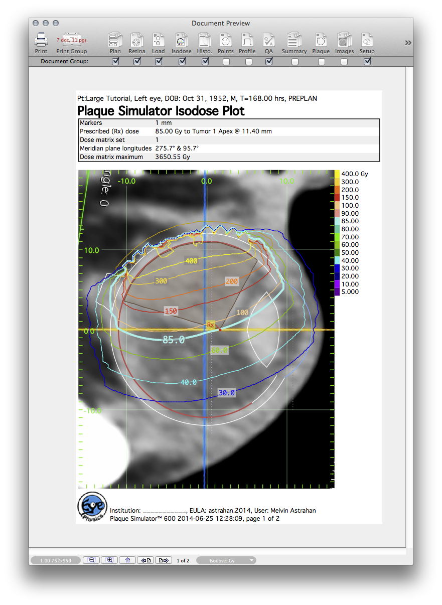 The Treatment Plan is a 3 page document that summarizes the entire simulation. Page 1 provides a table of patient identifiers, date & time of treatment, some radionuclide, plaque and tumor properties, a facial picture of the plaque and a miniature retinal diagram showing tumor location.