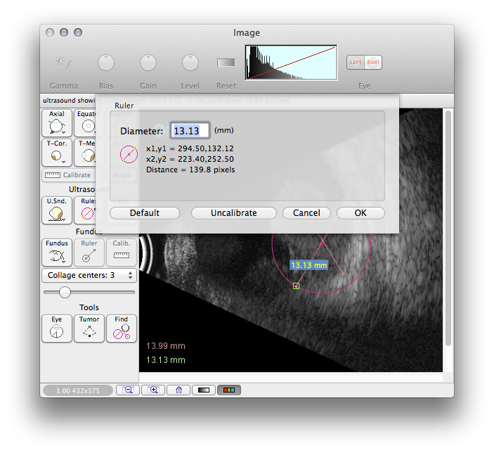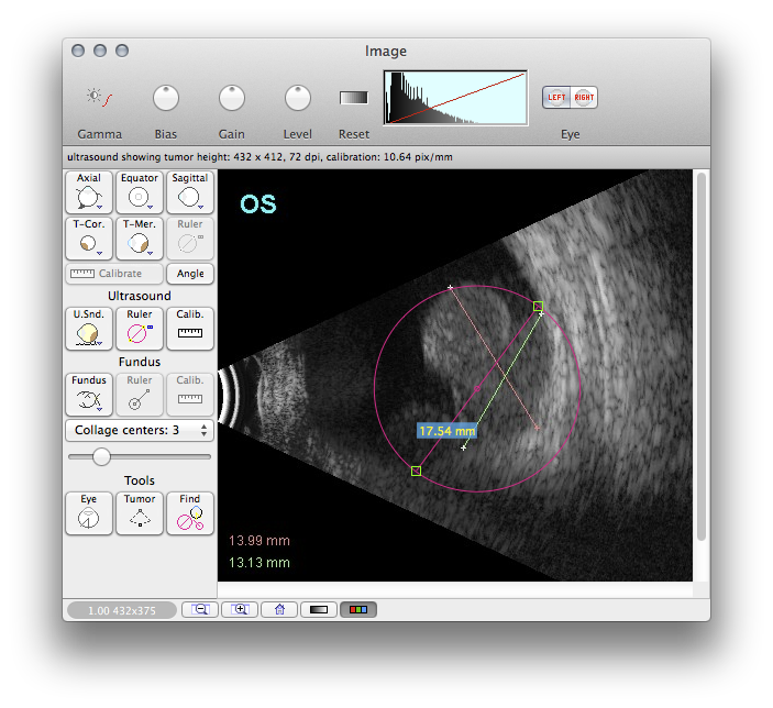 Drag the ruler tool to measure the tumor height (e.g. 11.43 mm) and the radial (meridian) base dimension (e.g. 17.53 mm) in the meridian plane. Note that the tumor height measurement depends upon the location of the tumor apex, the angle at which the imaging plane passes through the tumor and the curvature of the sclera below the tumor. As a result, the meridian plane is generally the most reliable image for measuring the tumor height.